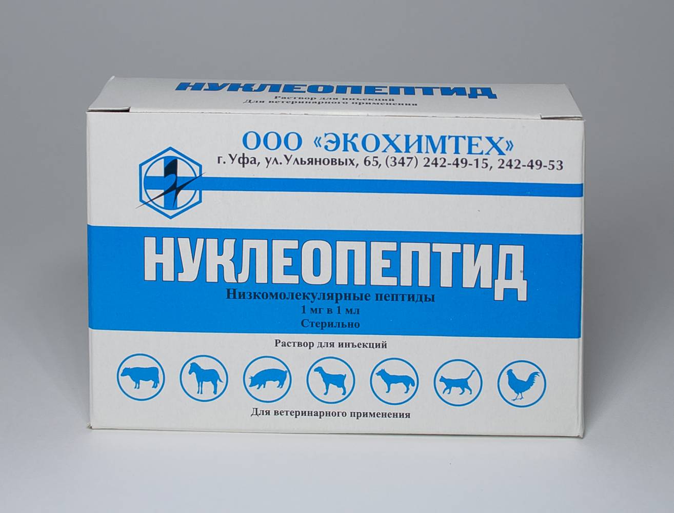 Нуклеопептид — разработка «Всероссийского государственного центра качества и стандартизации лекарственных средств для животных и кормов». ООО «Экохимтех» (г. Уфа) в 2004 году наладила собственное производство препарата.