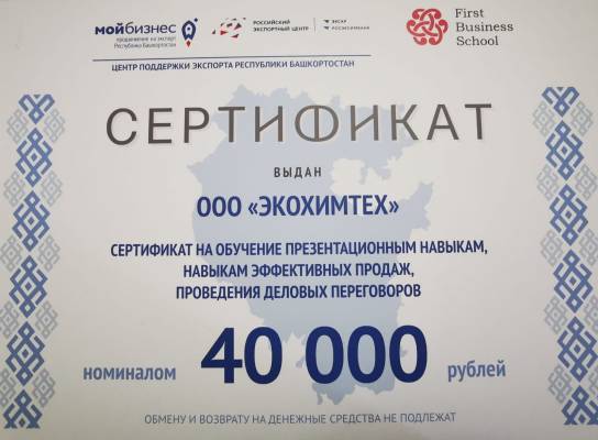 В номинации “Экспортер года в сфере агропромышленного комплекса среди субъектов малого и среднего предпринимательства” третьего места и сертификата “На обучение презентационным навыкам, навыкам эффективных продаж, проведения деловых переговоров” удостоилось общество с ограниченной ответственностью “Экохимтех”.